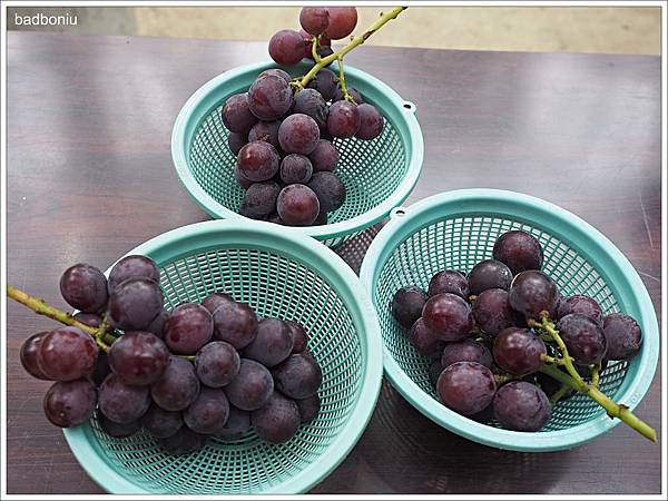旁邊也有小籃的綜合葡萄可以自取來吃喔!裡面有麝香葡萄及安藝葡萄,都不用錢!可惜我們已經採葡萄吃到太飽了,只能吃得下一籃了。
