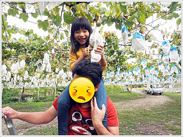 因為是葡萄採到飽,所以不限採幾次,只要吃完後都可以再回去葡萄田採。連踩梯子都不夠高的波妞當然只好坐在波妞爸的脖子上採葡萄啦~