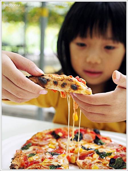 而且PIZZA還會牽絲唷~這PIZZA看起來不大,但因為我們剛剛肚子裡已經裝了不少的葡萄,所以一家三口吃剛剛好。