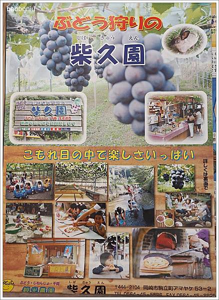日本的葡萄產季差不多在7月底開始,不過今年波妞家都還沒去日本吃到麝香葡萄,眼看著葡萄的季節就要進入尾聲了,這一次十月的名古屋行當然一定要把採葡萄也排進行程內囉!上網查了幾間名古屋的葡萄園,這間「柴久園」可以在網路上預約,所以就決定帶波妞來這裡採葡萄~
