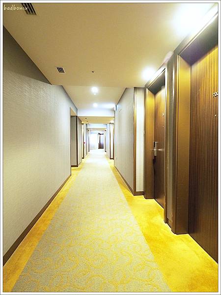 飯店呈狹長型,大門的正對面就有便利商店,方便買飲料跟泡麵