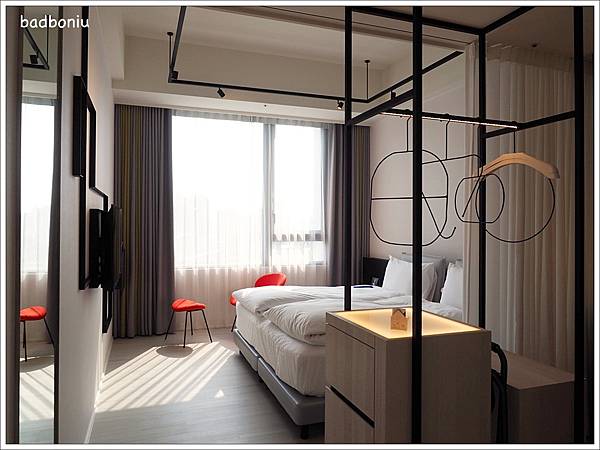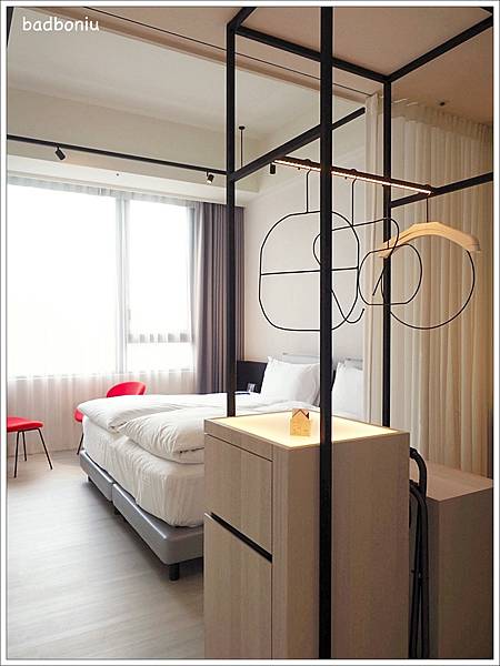 一開門最吸睛的就是開放式衣櫃中不規則的黑色衣架,波妞媽很努力地想參透到底這幾個衣架個別、或是融合在一起要傳遞什麼巧思?但對藝術沒有慧根的波妞媽還是參不透XD只知道這衣架真的讓簡單的房間多了「潮」的感覺。