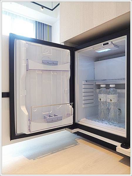 櫃子的門打開是靜音小冰箱,裡面有免費的礦泉水。