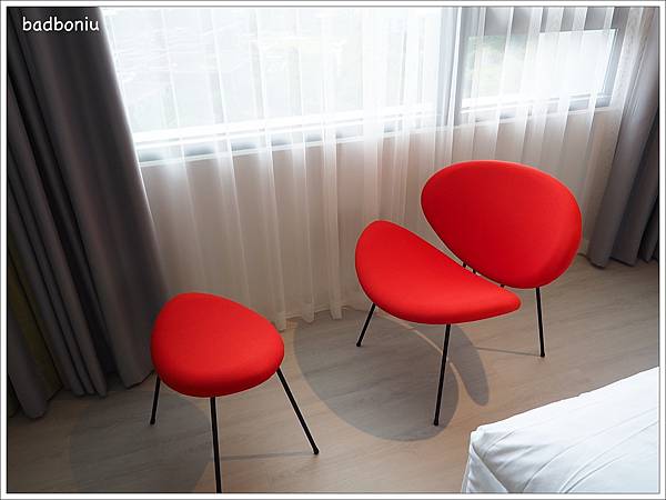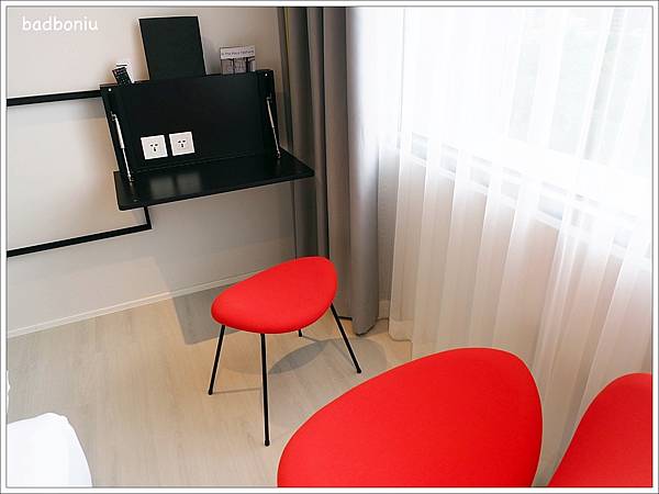 充滿設計感的火紅椅子也可以神救援為書桌椅,就可以坐在這邊打電腦趕文章了。