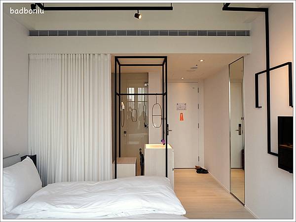 站在窗邊看過去,最牆邊是浴廁空間,跟客房以白色簾子做出空間區隔,拉上簾子後也讓人比較不那麼害羞。