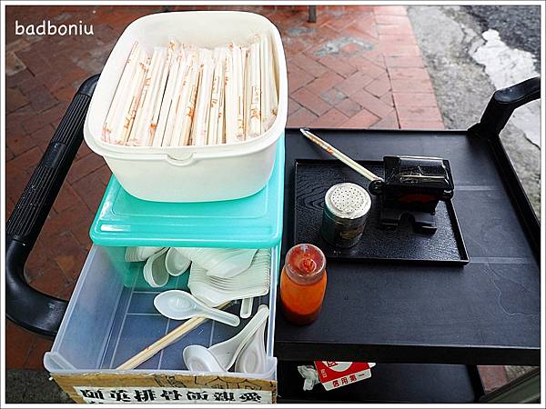 餐具在旁邊自取。聽說生意太好,所以現在吃排骨飯可以拿到發票了呢~