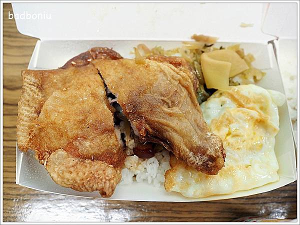 再來是普通的雞腿飯,不是特餐,所以就沒有自選三樣配菜,但有酸菜、蛋及醃蘿蔔片。雞腿的皮炸得很脆,但排骨還是比較吸睛XD