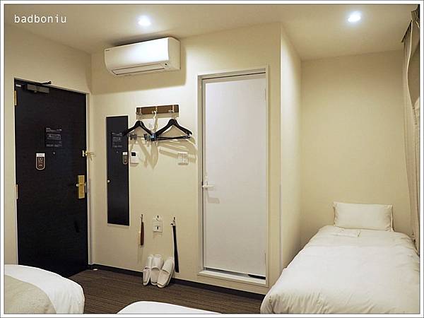 從雙人床這邊看過去,整個空間就是這樣了,房間不是太大,所以衣服只能吊掛在牆上的掛勾。