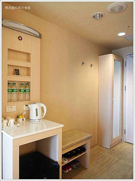 我們這次訂的是「港景溫馨四人房」,玄關有衣櫃、穿鞋椅及茶水櫃,穿鞋椅兼行李置放架下有兩種室內拖鞋,可以自行選擇。