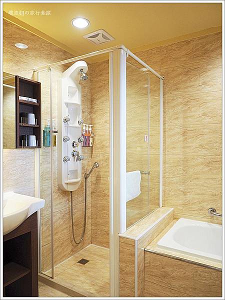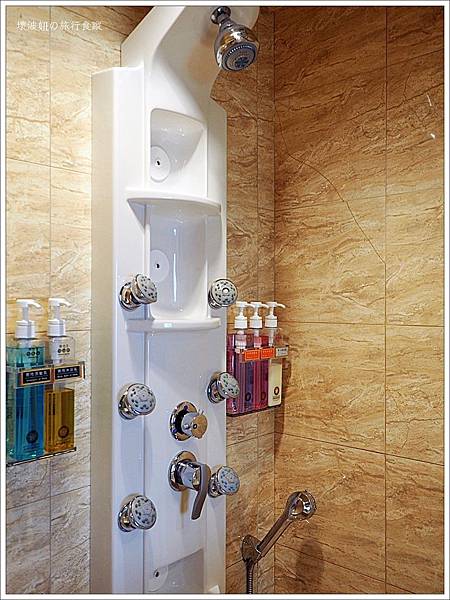 乾濕分離的淋浴間有花灑蓮蓬頭,還有多功能的按摩水柱,連沐浴備品都還分男生及女生的,真的是很熱鬧的淋浴間XD