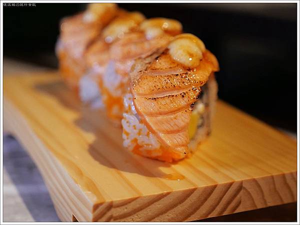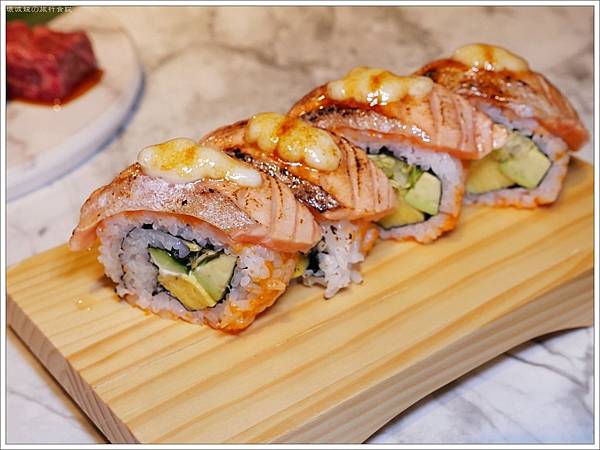 「鮭魚加州捲」$380,裡面還有酪梨與小黃瓜,也為較為重口的炙燒帶來一股清流