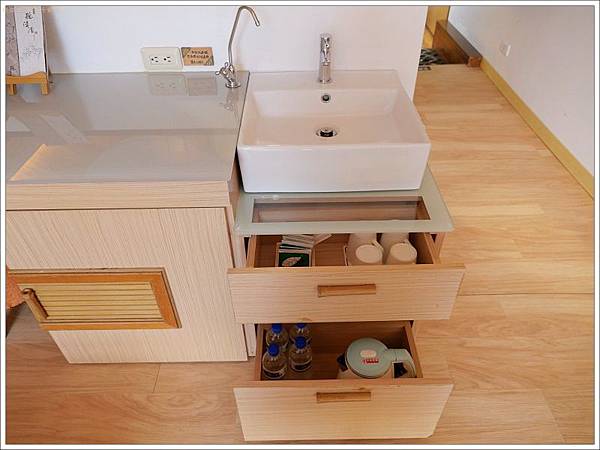 洗手台底下是快煮壺、瓶裝水及免費的茶包