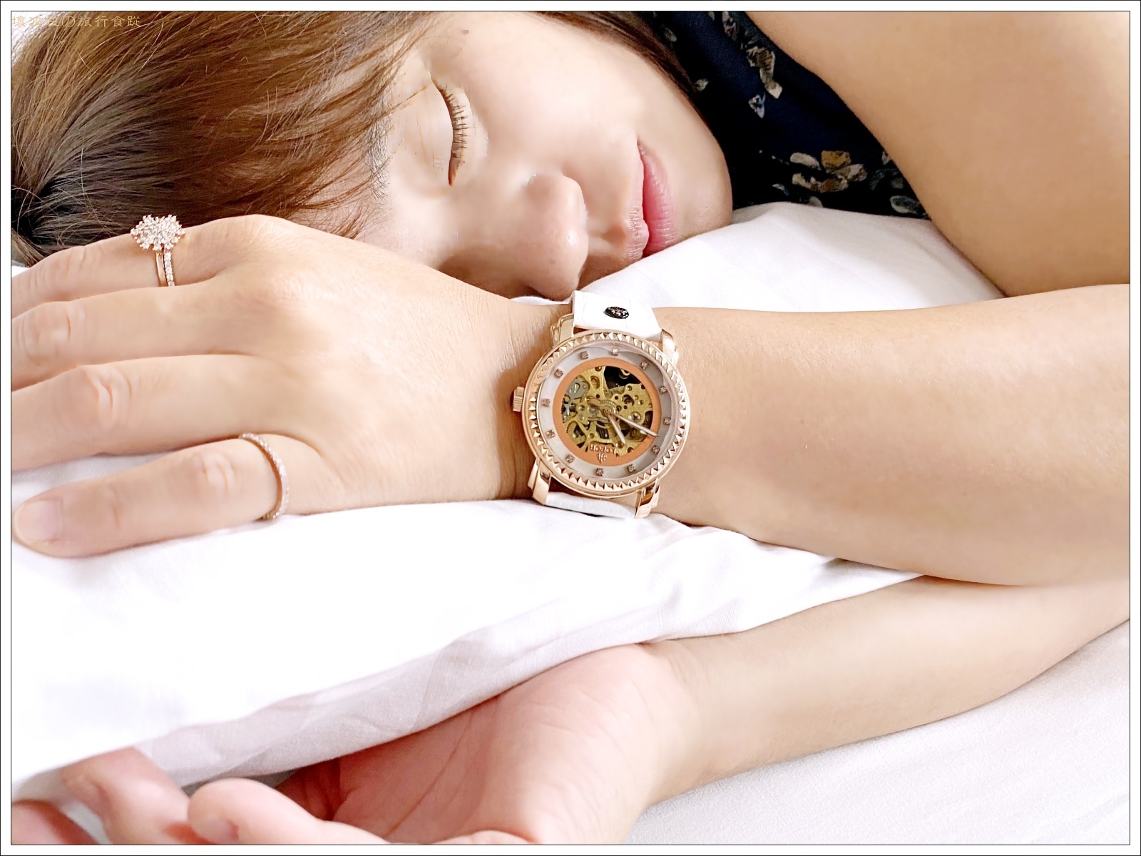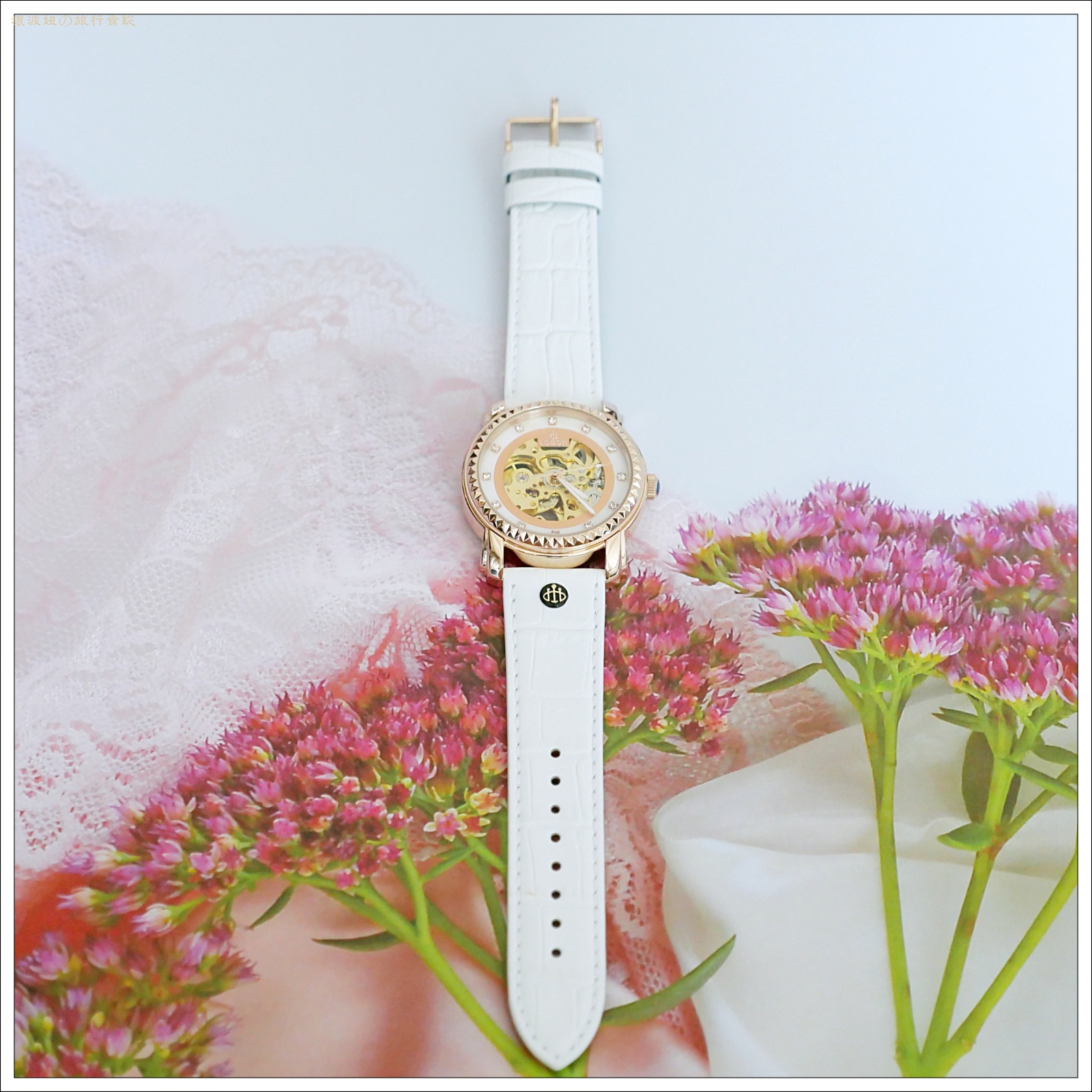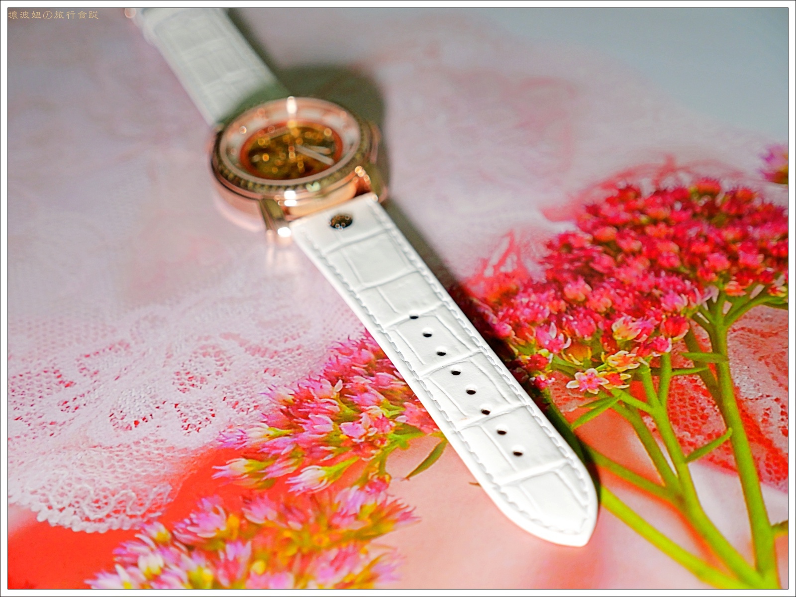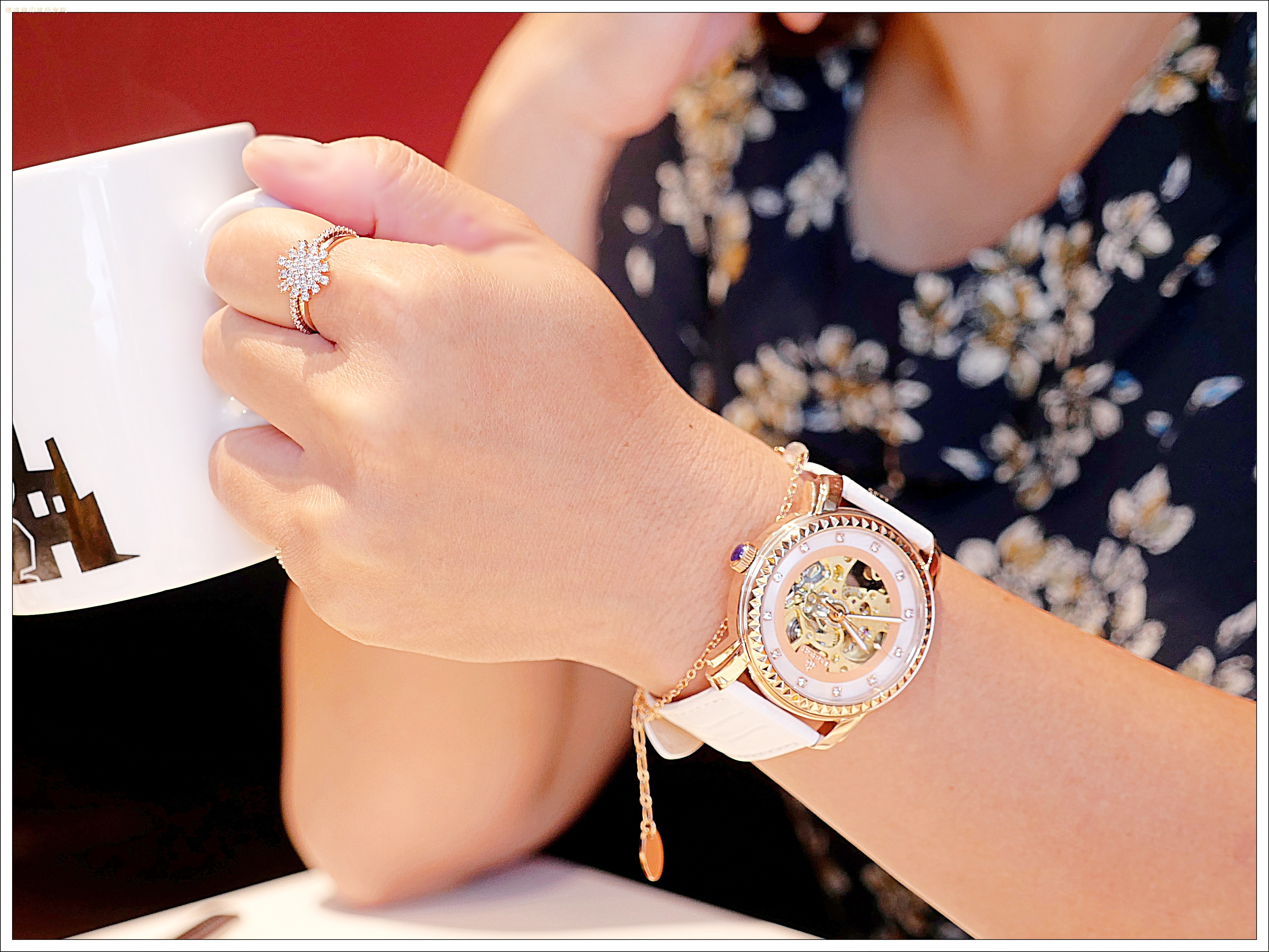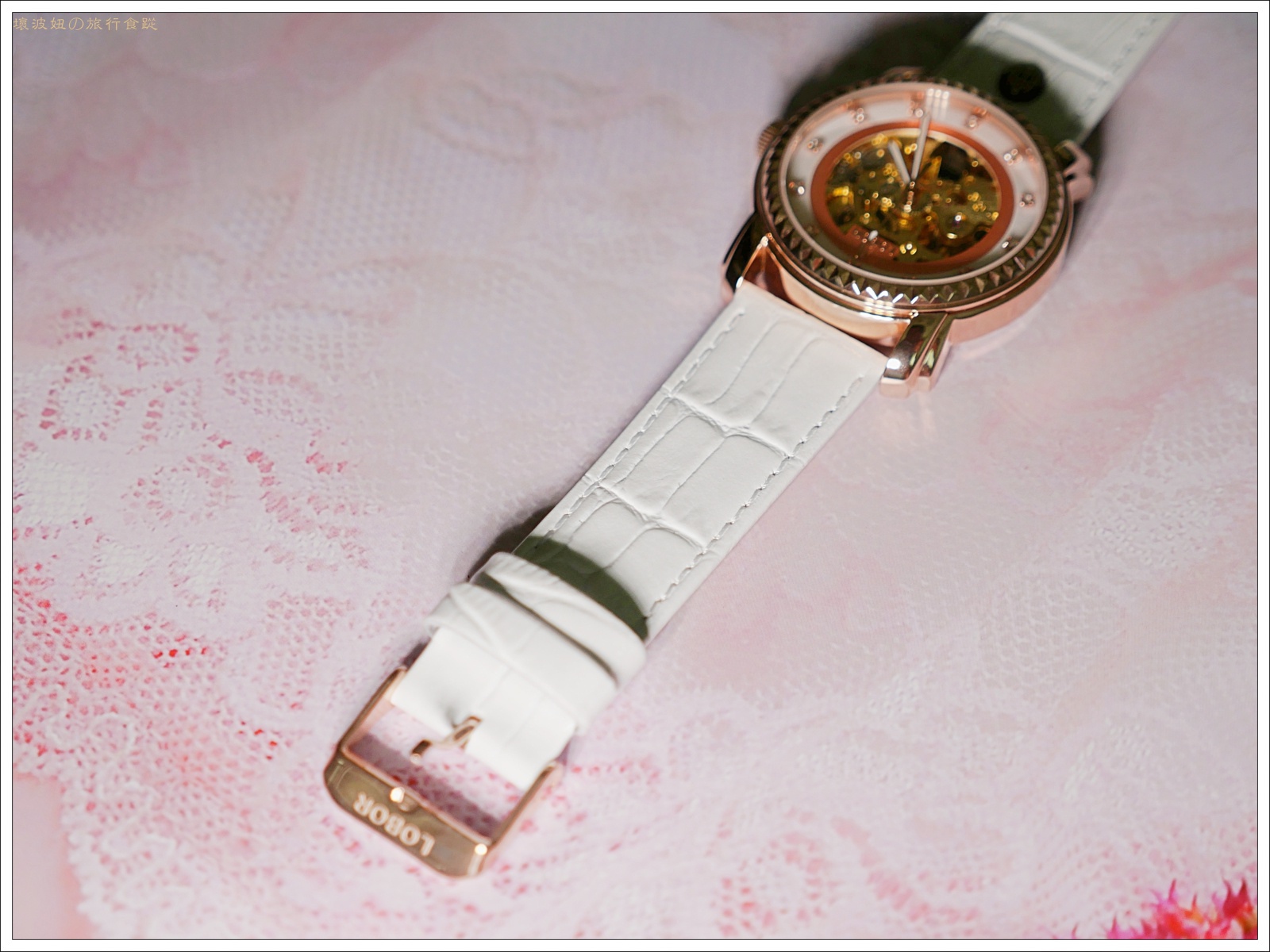 錶殼為拋光玫瑰金色,在光線照射下從水晶玻璃鏡面透出淡淡的仕女粉。從鏤空錶面看著機械齒輪的擺動,很容易讓人心神也跟著隨之轉動