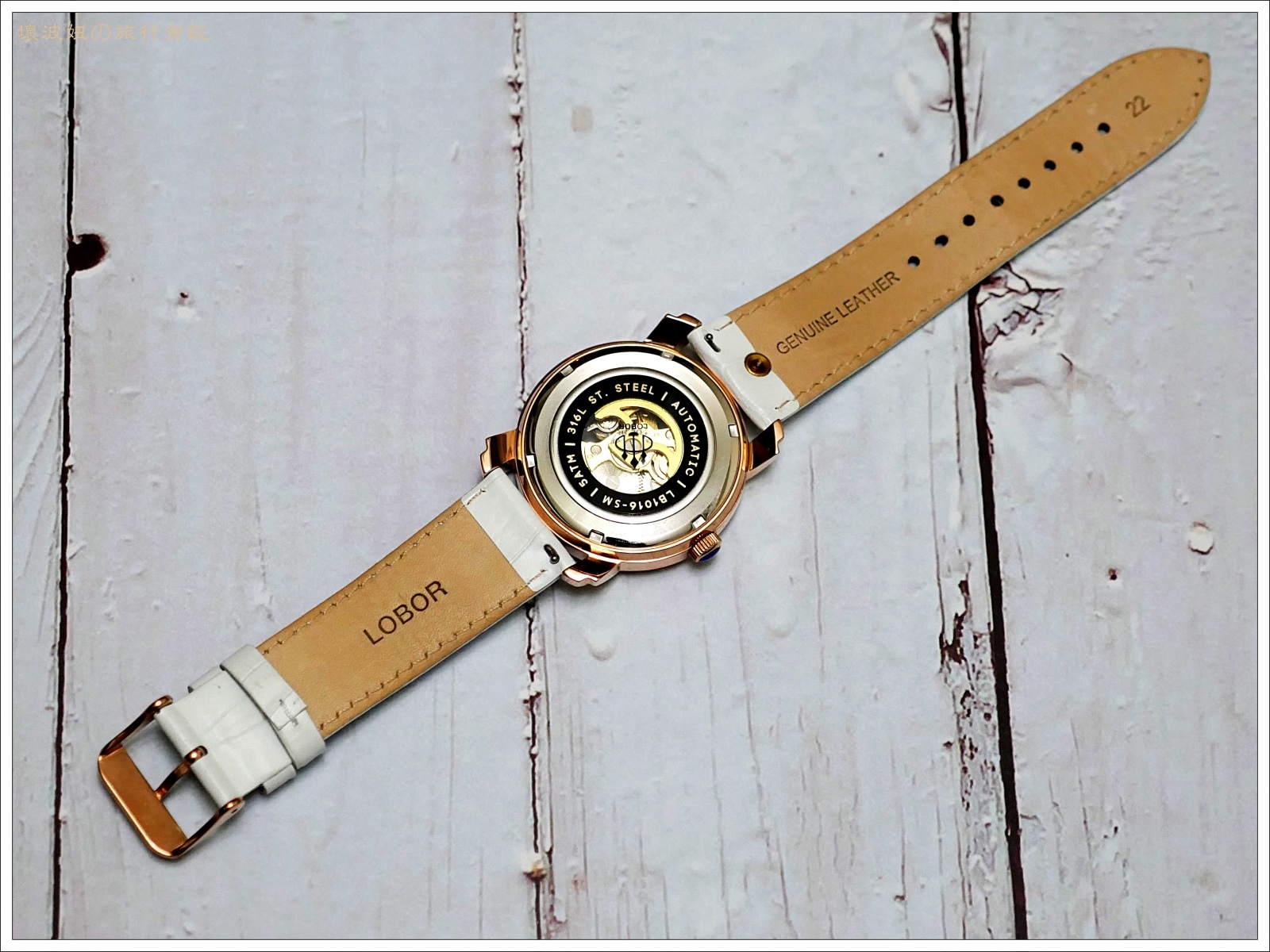 「PREMIER CORNWALL WHITE」錶殼的背面也是鏤空的! 錶帶為白色及皮革色互相搭配,並打上LOBOR的品牌名稱。