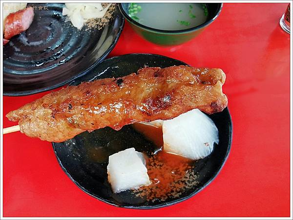 大家都很習慣的走到烤香腸這邊點餐,然後就會被請到旁邊的關東煮區點! 廖家黑輪真的好多媒體報導,幾乎是三民市場的活招牌了。