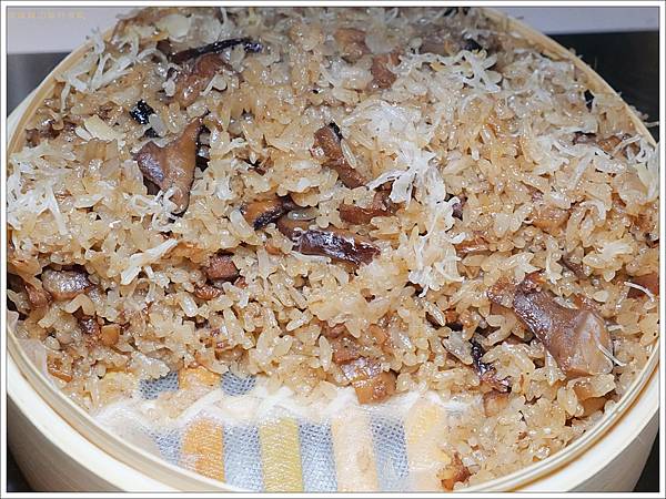 除了上面厚厚的干貝絲外,米糕裡面也都是滿滿的料,有國產豬三層肉肉絲,香菇和蝦米,而且仔細看還是長糯米及圓糯米混搭!