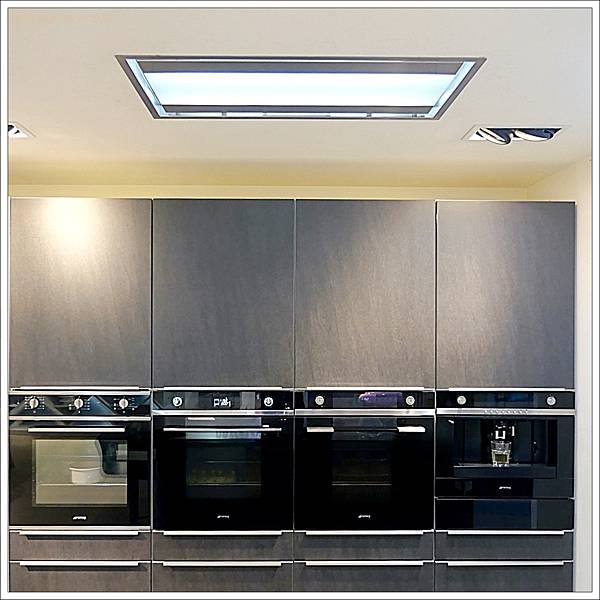 雖然眼前的烤箱也是SMEG的夢幻逸品,但是要請大家抬頭看這台「吸頂式」的排油煙機啦。