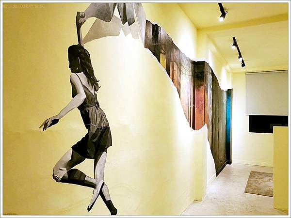 我們房間的插畫是個女孩撕開牆面,呈現出森林的樣貌,從水泥牆到森林就像是心境的轉換,給自己放鬆的契機。