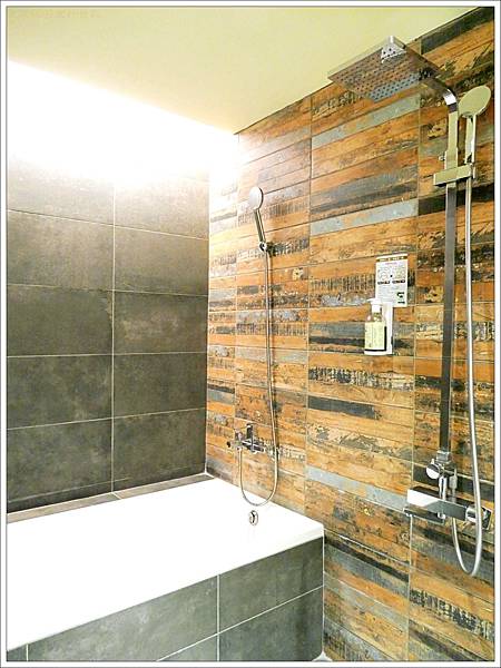 浴室空間也很大,外面使用復古的木紋壁磚,裡面則是易乾的石材。