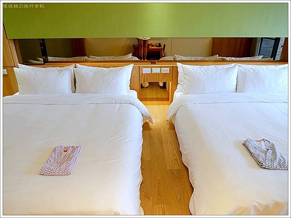 我們的房間配置了2張加大雙人床,窗外就是6樓的景觀露台,但因為房間位在邊邊,所以也不太會有人走過來。房間整體風格有種小清新卻又不失豪華感。床尾的走道還有蠻大的空間,擺10個行李箱也沒問題,但其實行李箱還有專用的行李架。 🤣