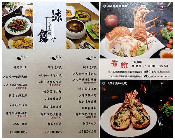 晚餐有兩人、四人、六人合菜可以選,還可以加購龍蝦,每隻$680 是很公道的價格喔!