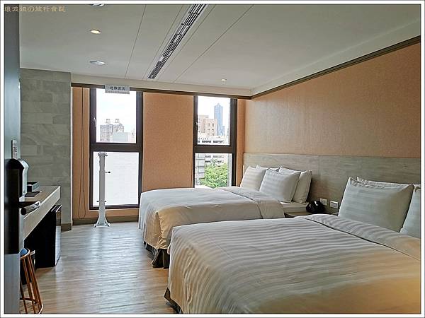 房間配置2張雙人床(應該是6x7),每張床豪華的放上4顆枕頭。住的是7樓,所以有逃生設備,但不曉得是不是7樓每間房間都有這個可以吊掛出去的設備就是了。