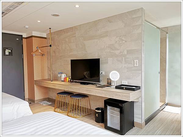 電視機的後面是衛浴,只用兩根桿子組裝成「極簡風」掛衣架,其實房內的空間很足夠,不太需要省這個空間啦!