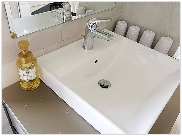 洗手台在淋浴間外,所以就算有人洗澡或用廁所,也可以使用。不過亮點是那瓶讓人很熟悶的洗手乳,不就是日本飯店很常見到的那瓶嗎? 突然讓我覺得好有親切感。
