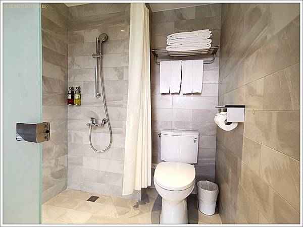 浴室跟廁所在一起,中間用浴簾隔開,可惜了沒有安裝免治馬桶。